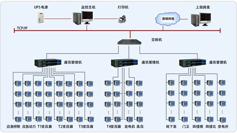 本監(jiān)控系統(tǒng)主要實現(xiàn)對月亮灣集中供冷中心的20/0.4kV配電系統(tǒng)進(jìn)行監(jiān) 控;監(jiān)控范圍為變電所的T1、T2、T3、T4變壓器進(jìn)線柜、聯(lián)絡(luò)柜、應(yīng)急照明配電屏1/2、應(yīng)急動力配電屏1/2、高壓柜、變電所的1/2#柴油發(fā)電機(jī)配電屏和各樓層所有動力柜。總共300個回路。