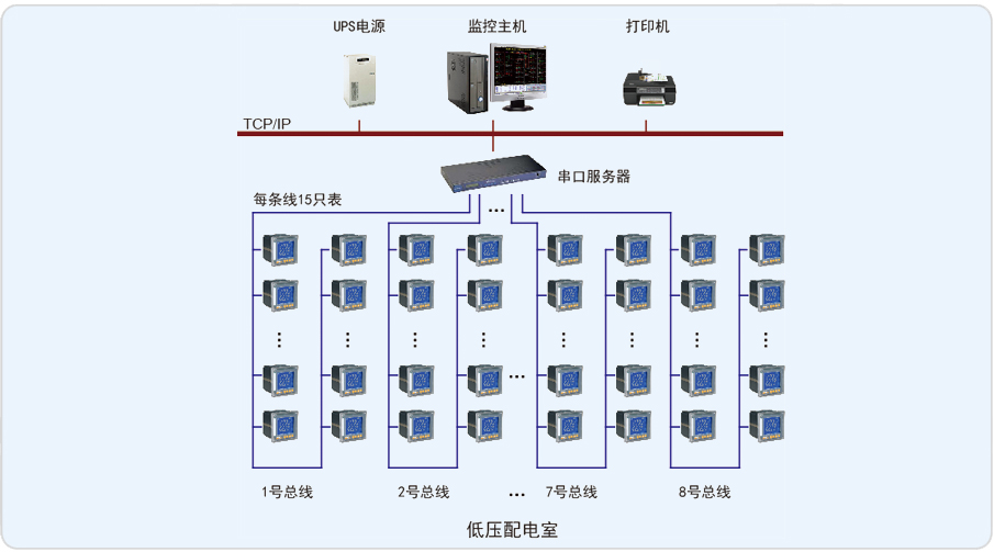 淄博歐木特種紙業(yè)有限公司四期電力監(jiān)控系統(tǒng)針對淄博歐木特種紙業(yè)有限公司內四期低壓配電室開關柜內安裝的約120只安科瑞智能電力儀表,監(jiān)控室位于配電室內。為滿足配電室統(tǒng)一監(jiān)控的要求,配電室現(xiàn)場安裝安科瑞公司網(wǎng)絡電力儀表通過屏蔽雙絞線手拉手相連至串口服務器,串口服務器通過五類線接入后臺主機,進行數(shù)據(jù)傳輸。