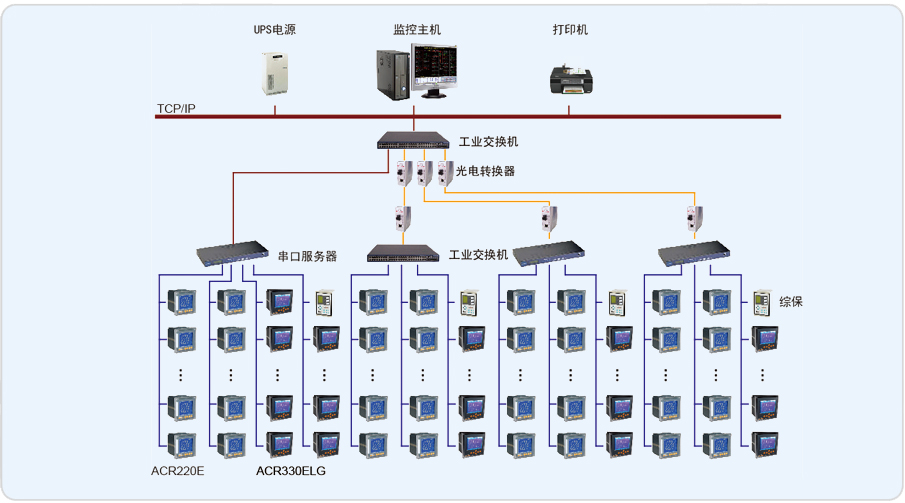 Acrel–3000軟件通過中間采集設(shè)備采集現(xiàn)場(chǎng)電力監(jiān)控儀表數(shù)據(jù),并在系統(tǒng)一次圖顯示出來。主要實(shí)現(xiàn)功能如:遠(yuǎn)程抄表查,詢各個(gè)配電室各個(gè)回路按照時(shí)間段進(jìn)行歷史數(shù)據(jù)查詢。趨勢(shì)曲線,功率實(shí)時(shí)趨勢(shì)顯示及歷史趨勢(shì)查詢功能。系統(tǒng)遙信狀態(tài)報(bào)警,根據(jù)本系統(tǒng)的設(shè)計(jì)意圖,如果重要回路或者照明回路三相中某一相電流負(fù)荷超過額定值的90%,系統(tǒng)需要立刻發(fā)出聲光報(bào)警并彈出指示框指明報(bào)警源,提醒管理人員注意負(fù)載的三相平衡和負(fù)載率,同時(shí)自動(dòng)記錄事件發(fā)生的時(shí)間和回路名稱,以便用戶查詢,追憶故障原因。