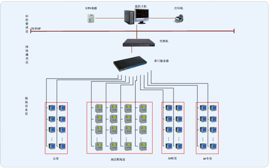 該項目由一個10KV高壓變電所,一個公變,以及兩個專變組成。該項目通過接入的21臺微機保護、50臺PZ96L-E4和兩臺溫控儀,監測配電安全,保證變壓器在安全范圍內運行。通過專變和公變的同時監測,監測整個工廠的耗能情況,確定高耗能范圍,實施節能措施,筑建綠色工廠。