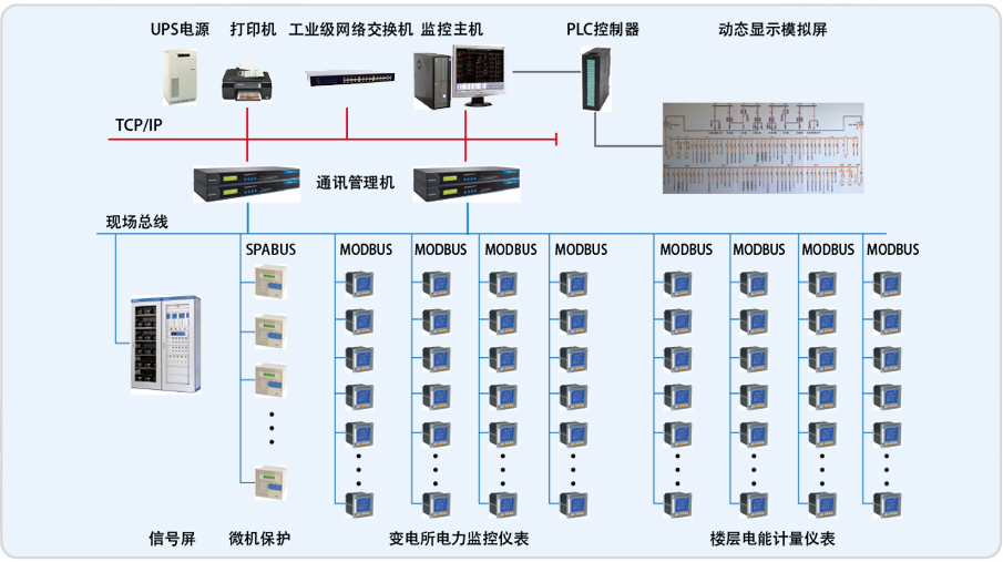 整個系統采用網絡分布式結構,監控主機位于地下一層變電所值班室內,各變電所配電柜內安裝有本公司ACR330ELH、ACR220EFLK儀表共計200多回 路,第三方設備共計200多臺。系統采用開放的通訊協議,通過現場總線與高低壓配電系統、變壓器溫控裝置、直流屏、模擬屏實現數據通訊功能。同時監視系統提供標準的RS485接口向上連接到BMS系統。