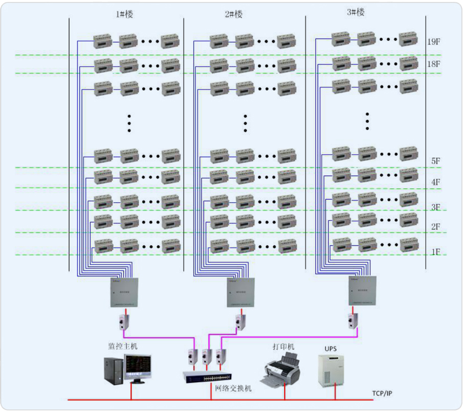 項(xiàng)目對黃金時代大廈各動力箱、照明箱等終端配電箱內(nèi)各用電回路用電量進(jìn)行電能管理,系統(tǒng)通過多功能的電能計(jì)量表計(jì)、通訊網(wǎng)絡(luò)和計(jì)算機(jī)軟件,實(shí)現(xiàn)各用電設(shè)備在運(yùn)行過程中的實(shí)時數(shù)據(jù)采集、數(shù)據(jù)計(jì)算、數(shù)據(jù)統(tǒng)計(jì)、用電分析等,保證復(fù)雜供配電系統(tǒng)的安全可靠系數(shù),實(shí)現(xiàn)故障快速響應(yīng);掌握大廈能源消耗的成本結(jié)構(gòu),確保節(jié)能計(jì)劃和措施順利實(shí)施;科學(xué)、智能管理,提高效率,降低損耗,實(shí)現(xiàn)經(jīng)營成本優(yōu)化。系統(tǒng)由站控管理層、網(wǎng)絡(luò)通訊層和現(xiàn)場設(shè)備層構(gòu)成。系統(tǒng)要求盡量減少集中采集數(shù)據(jù)的裝置以保證系統(tǒng)的通訊可靠性。