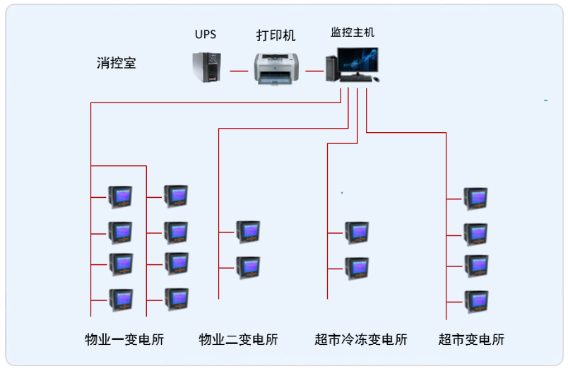 系統(tǒng)采用Acrel-2000型電力監(jiān)控系統(tǒng),整個(gè)系統(tǒng)采用網(wǎng)絡(luò)分布式結(jié)構(gòu),監(jiān)控主機(jī)位于消防監(jiān)控室中,其他4個(gè)配電室分別位于地下一層。該項(xiàng)目實(shí)現(xiàn)了湖州萬達(dá)4個(gè)10kV變電所的智能管理。所有監(jiān)控設(shè)備均通過屏蔽雙絞線至后臺(tái)監(jiān)控主機(jī),從而實(shí)現(xiàn)遠(yuǎn)程監(jiān)控。