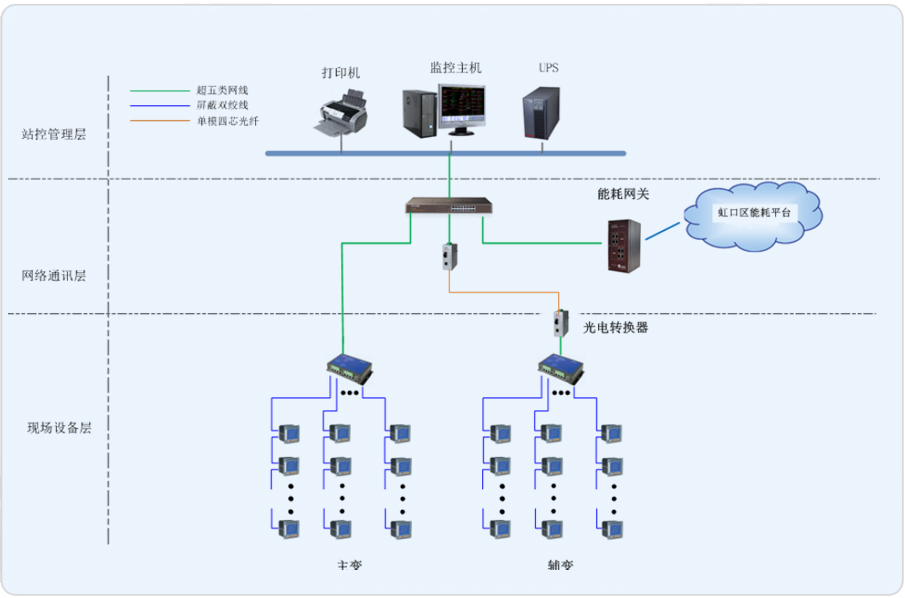 根據(jù)上海虹口區(qū)的相關(guān)能耗導(dǎo)則,現(xiàn)針對(duì)虹口區(qū)的兩個(gè)變電所實(shí)現(xiàn)能耗的實(shí)時(shí)監(jiān)控,并按照區(qū)域能耗平臺(tái)的數(shù)據(jù)要求,將虹口足球場(chǎng)的用能分為空調(diào)用電、照明插座用電、動(dòng)力用電以及特殊用電,將以上數(shù)據(jù)不間斷上傳至虹口區(qū)能耗平臺(tái)。