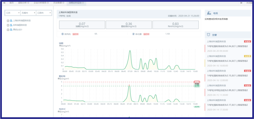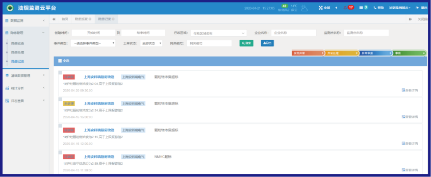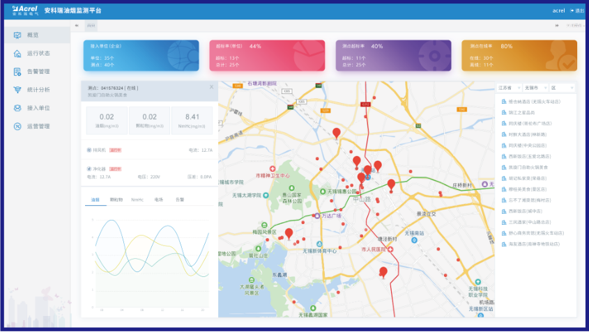 平臺GIS地圖采集餐飲油煙處理設(shè)備運行狀態(tài)和油煙排放的濃度數(shù)據(jù),自動對超標(biāo)排放及異常企業(yè)進行提示預(yù)警,可迅速進行處理,督促餐飲企業(yè)整改設(shè)備,并定期清洗、維護,實現(xiàn)減排環(huán)保,不擾民等目的。